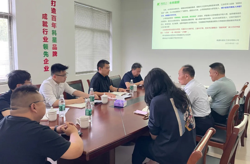 2025年9月11日下午,南通市發改委經濟運行調節處處長王帥軍,四級主任科員俞榮、姬一峰,海安市發改委黨組副書記、副主任楊成龍,白甸鎮副鎮長郭勇及經發辦相關負責人蒞臨南通科星化工股份有限公司開展走訪調研工作。